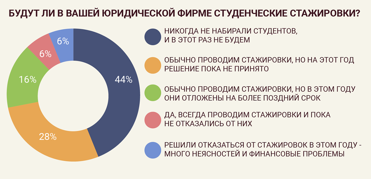 Решение сохранить стажировки несмотря на финансовые сложности и ситуацию с пандемией приняли в компаниях 6% опрошенных юристов.