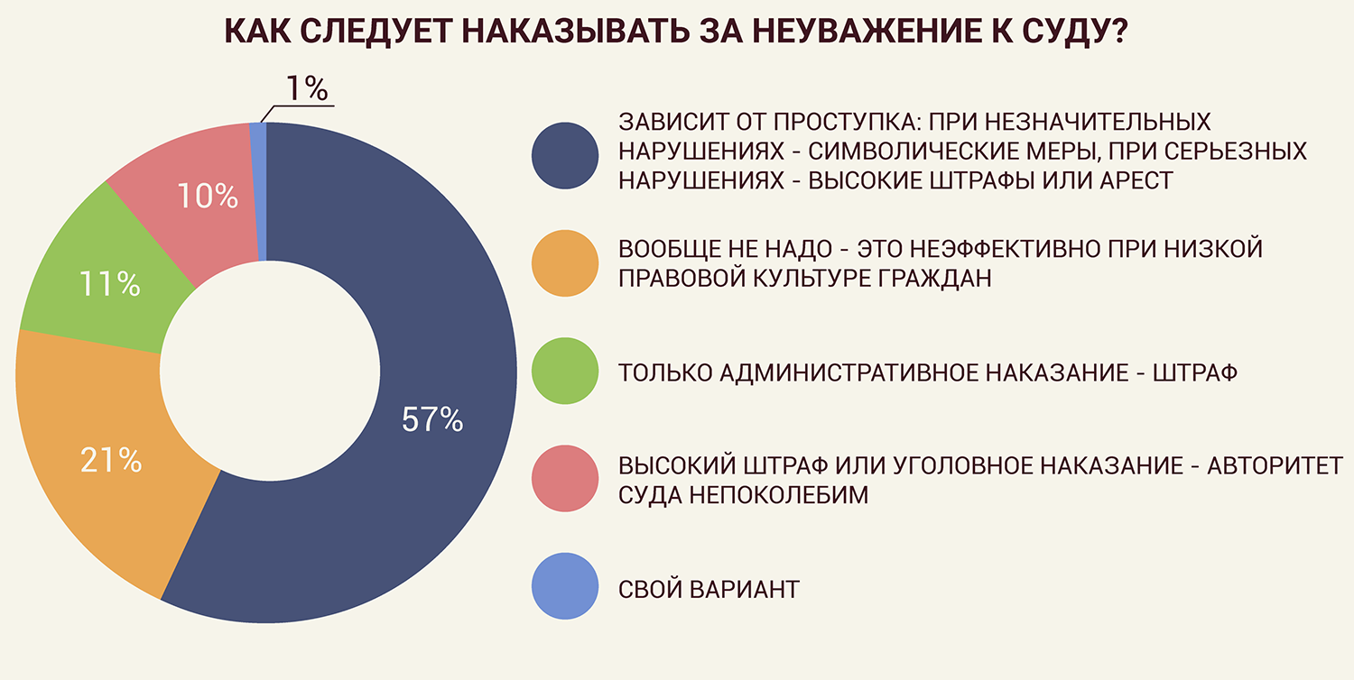 При этом пятая часть респондентов - 21% - высказались против каких-либо наказаний в принципе. Они согласны с рядом экспертов, которые уверены: при низком уровне правовой культуры высокие штрафы вряд ли внушат уважение к судебной системе. "Мы должны заниматься не тем, как наказать виновных за "неуважение к суду", а направить свои силы на создание таких условий, при которых будут отсутствовать какие-либо основания для такого поведения, в том числе на повышение доверия к судебной системе и уровня правового сознания и культуры граждан", - отмечала Екатерина Баглаева, Юков и партнеры.