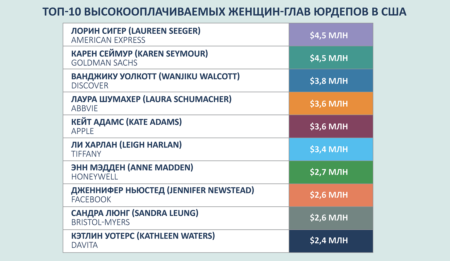 В 2019-м сократился разрыв между оплатой труда мужчин и женщин. Если учитывать в объеме вознаграждения полученные акции, то женщины займут пять мест из топ-10, среди которых три позиции из топ-4: Сьюзан Хелфрик (Susan Helfrick) из Chewy ($30,3 млн), Кейт Адамс (Kate Adams) из Apple ($25,2 млн) и Дженнифер Ньюстед (Jennifer Newstead) из Facebook ($19,1 млн).