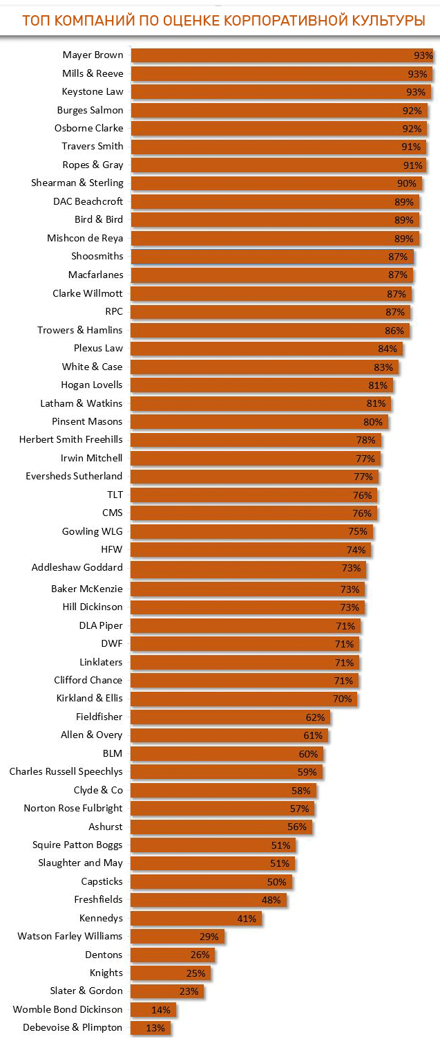 При исследовании «уровня счастья» отдельных сотрудников издание RollOnFriday выяснило, что самыми довольными оказались партнеры компаний: их уровень удовлетворения от работы оказался около 84%; внизу списка оказались младшие юристы: здесь показатель составил менее 70%.
