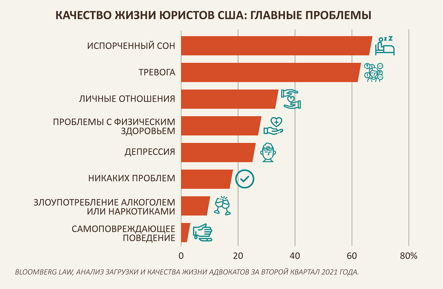 На первых местах в списке проблем, ухудшающих качество жизни, нарушения сна и тревожные состояния, сообщает Bloomberg Law. Проблемы в личной жизни, физическое здоровье и депрессия также касаются более 25% респондентов.