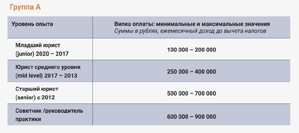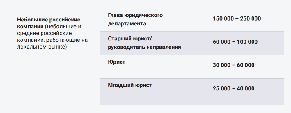 Средние по объему бизнеса российские компании готовы платить главе юридического департамента 400 000–800 000 руб., старшим юристам — 250 000–350 000 руб., юристам — 100 000–200 000 руб., младшим юристам — 60 000–100 000 руб.