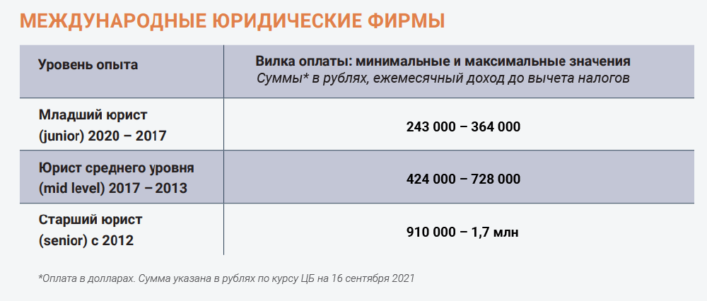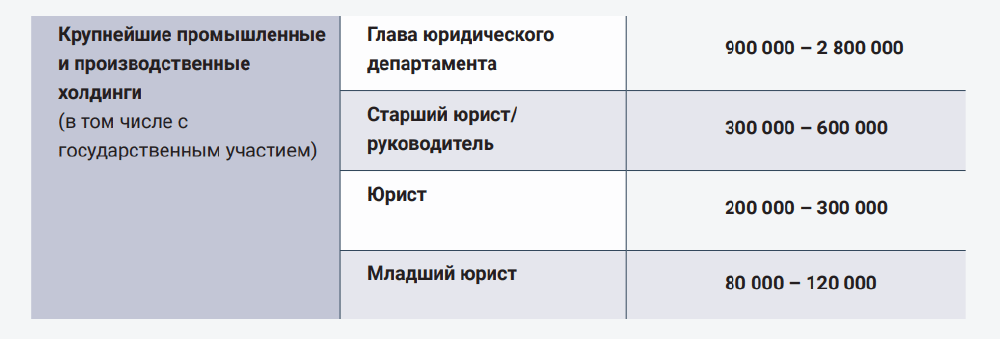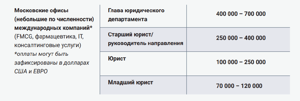 Крупные международные корпорации (ретейл, потребительские товары, фармацевтика, IT) платят главам юрдепартаментов от 500 000 до 900 000 руб. в месяц, старшим юристам — 170 000–400 000 руб., юристам — 100 000–200 000 руб., а младшим юристам — 70 000–100 000 руб. При этом зарплата может быть зафиксирована в долларах или евро.