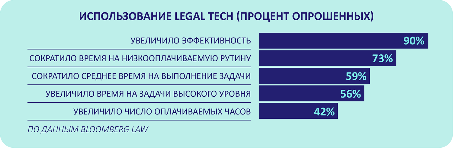 90% респондентов согласились, что технологии увеличили эффективность в их организации. 73% отметили, что LegalTech сократил время на простые рутинные задачи. Это не значит, что люди стали меньше работать, просто они теперь выше оценивают качество задач и творчество (72%).