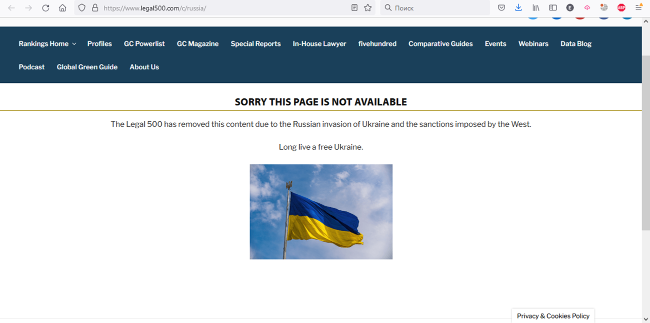 На сайте международного рейтинга The Legal 500 стал недоступен раздел с информацией о юридическом рынке в России. Вместо него отображается украинский флаг и сообщение, что контент удален из-за «российского вторжения на Украину и введенных странами Запада санкций».