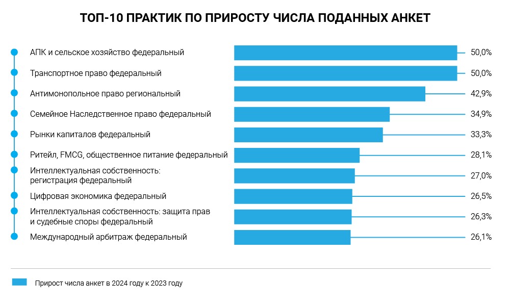 В топ-10 практик по числу поданных анкет вошли две региональные (арбитражное судопроизводство и банкротство) и восемь федеральных:
