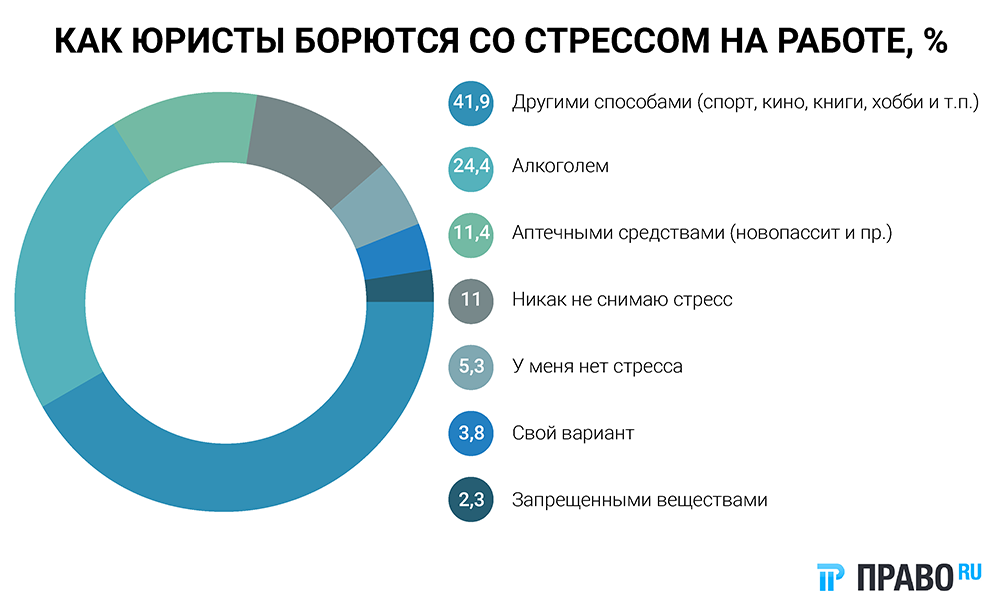 То, что профессия юриста может привести и к серьезной профдеформации, и к депрессии признают юристы и в России (Недостатки – или продолжения достоинств: что такое профдеформация юристов). В опросе, проведенном Право.ru в прошлом году, мы попытались выяснить, насколько серьезны проблемы российских представителей юридической профессии. О том, что с проблемой стресса они не сталкиваются, сообщили только чуть больше пяти процентов опрошенных. Еще 11% ответили, что никак не снимают стресс. При этом почти четверть признали, что проблему помогает решить алкоголь, еще 11,4% респондентов указали, что прибегают к лекарствам, 2,3% указали, что им помогают запрещенные вещества.