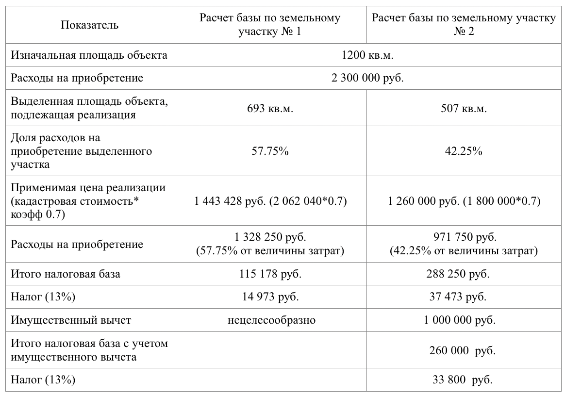 Для наглядности приведем пример расчета налоговой базы по НДФЛ в случае реализации в одном налоговом периоде двух земельных участков. Первый — площадью 693 м² (кадастровая стоимость 2 062 040 руб.), второй — 507 м² (кадастровая стоимость 1 800 000 руб.). Оба этих участка разделены из первоначального участка площадью 1200 м², стоимость приобретения которого, согласно договору, составила 2 300 000 руб.