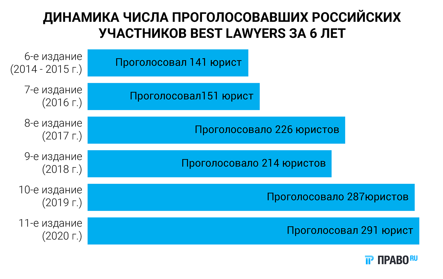 Нынешняя российская версия Best Lawyers - уже 11-я по счету, в прошлом году региональное направление отметило свой 10-летний юбилей и достигло рекордных за последние пять лет показателей как по числу участников рейтинга, так и по их активности. В целом по миру охват рейтинга расширяется - так, если в издании 2019 года признание получили юристы из 150 компаний, в этом году число юрфирм с отмеченными специалистами возросло до 263. Интерес к рейтингу в России также продолжает расти. В издании рейтинга-2020 голосовали около 300 юристов.