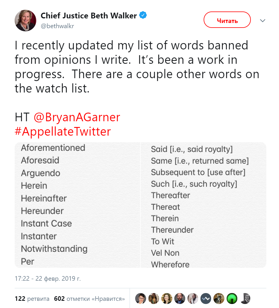 Ранее в этом году председатель Верховного апелляционного суда Западной Вирджинии Бет Уокер написала в Tвиттере список слов, которые она никогда не употребляет в собственных заключениях.