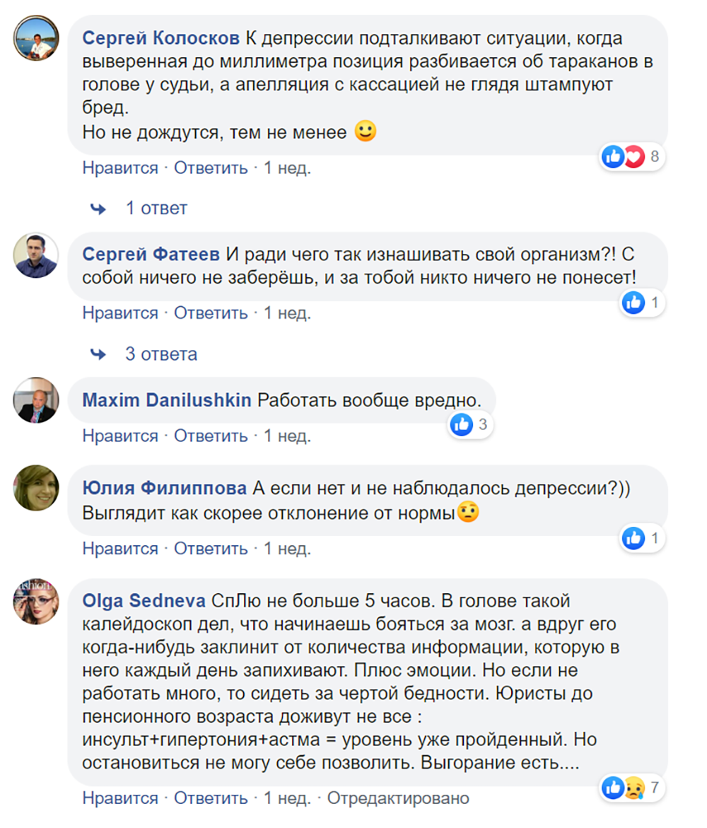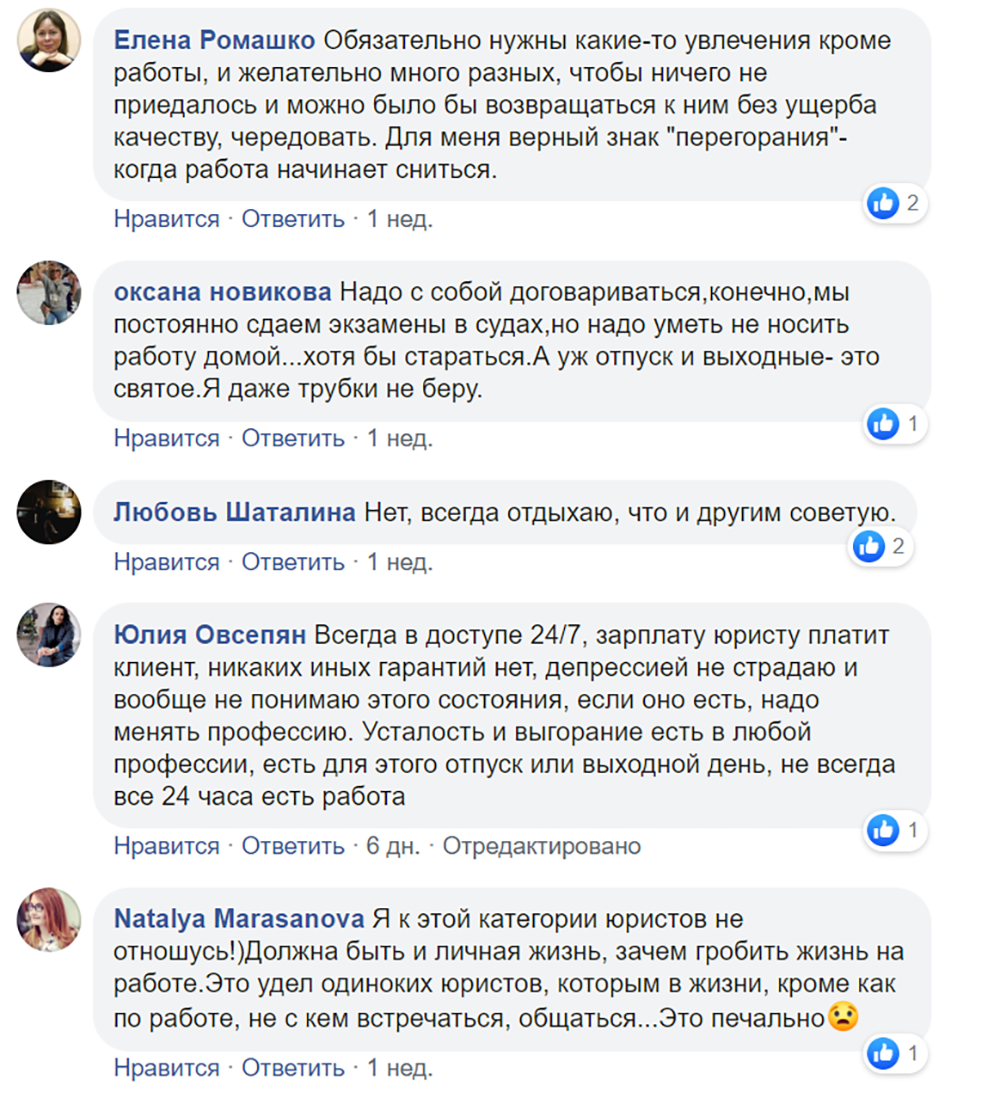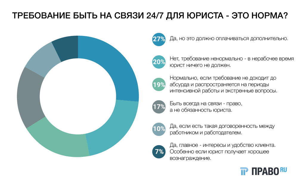 Исследования американских специалистов показывают, если юрист на связи со своими клиентами круглые сутки, то это может привести к проблемам с психическим здоровьем. Большинство участников опроса, проведенного «Право.ru», соглашаются с тем, что подобный график – норма для юриста, которая должна оплачиваться дополнительно. Пятая часть участников голосования уточняют, что разумным такой режим работы стоит считать лишь для разрешения экстренных вопросов и завершения неотложных проектов. Примерно столько же проголосовавших полагают, что доступность юристов 24/7 – это ненормально. Быть всегда на связи – это право, а не обязанность специалиста, уверены 17% опрошенных.