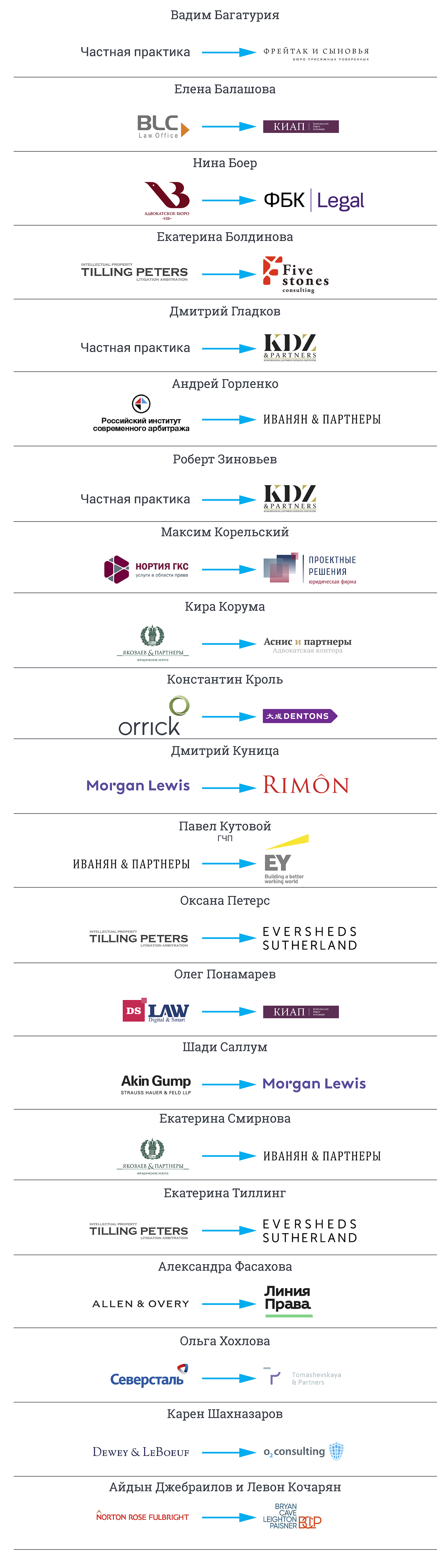2019 год оказался противоречивым в вопросе о переходах юристов. С одной стороны, наметилось движение внутри компаний. Ряд фирм продвинули в партнеры собственных юристов. Активность продемонстрировали не только российские, но и международные юрфирмы, отмечалось в докладе рекрутинговой компании Norton Caine. Например, в Baker McKenzie партнерами стали Кирилл Викулов и Сергей Ломакин, в Allen&Overy – Булат Жамбалнимбуев и Олег Хоменко, в Dentons – Константин Третьяков, в Bryan Cave – Татьяна Паршак. На фоне прежнего негативного тренда, демонстрировавшего только снижение активности и выход партнеров, это можно воспринять как позитивное изменение и развитие. На рынке появились и новые "ильфы" - редкое явление в последние кризисные годы. В Москве открылся офис международной фирмы Rimon. Во главе российского подразделения компании - Дмитрий Куница, бывший партнер Morgan Lewis.