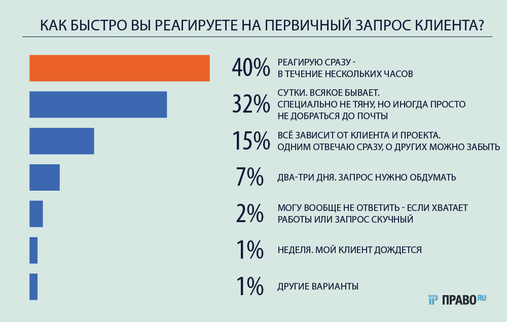 15% опрошенных юристов указали, что скорость их ответа зависит от обстоятельств - от клиента и проекта. Скорее всего, запрос рассмотрят сразу, но в случае перспективного дела ответ будет моментальным, а о других, менее интересных, вопросах можно забыть, признались юристы.