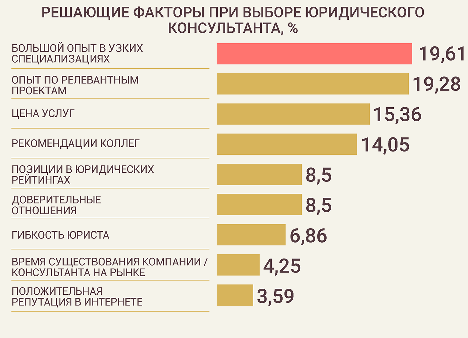 По данным исследования, решающее значение при выборе консультанта имеет узкоспециализированный опыт компании (19,61%) и наличие релевантных проектов (19,28%). Кроме того, 15,36% юристов отметили, что при выборе консультанта важную роль играет стоимость услуг.