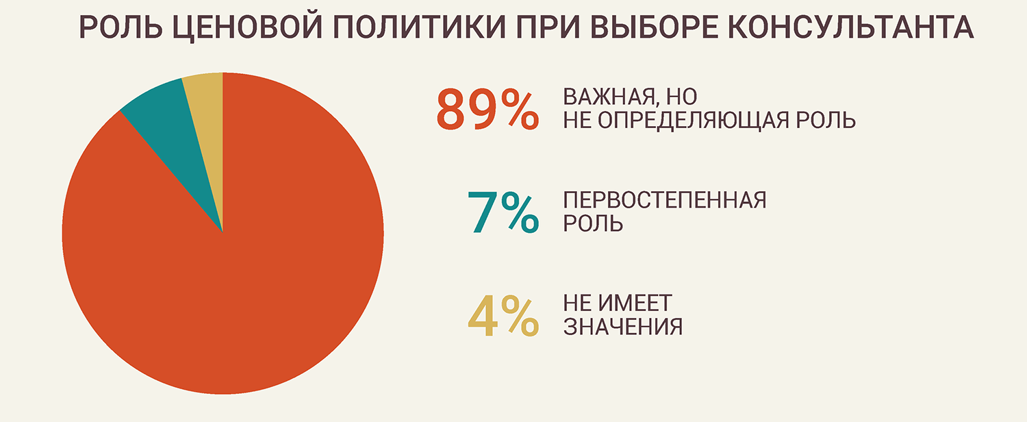 По данным исследования, ценовая политика юридической фирмы является достаточно важным, но не определяющим фактором при выборе консультанта. Об этом заявили 96% респондентов. Первостепенное значение фактор цены имеет только для 7,41% участников исследования.