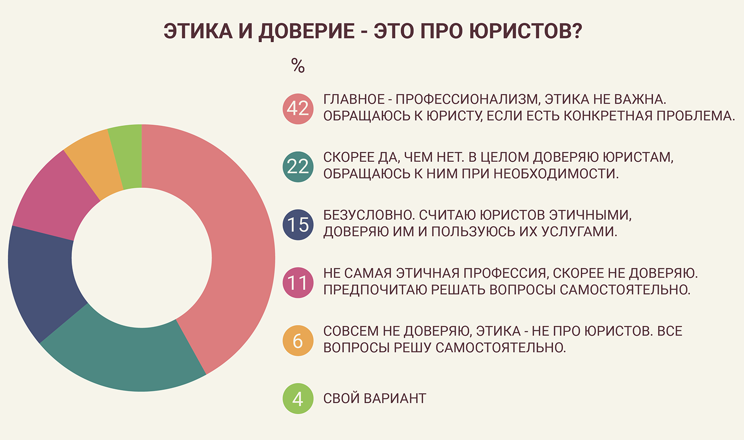 Безусловно доверяют юристам и считают профессию этичной только 15% опрошенных. Еще 22% указали, что скорее доверяют представителям этой профессии и обращаются к ним при необходимости.