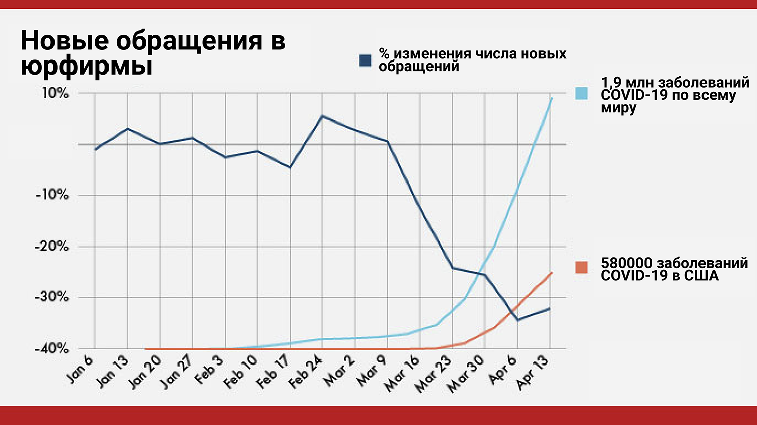 В связи с ростом числа заболевших COVID-19, в марте резко сократилось число новых обращений в юридические фирмы – более чем на 30% по сравнению с первыми пятью неделями 2020 года, более чем на 40% по сравнению с самыми высокими средненедельными показателями за год. Данные по США представила компания Clio. Согласно результатам другого опроса, 56% юристов отмечают значительное снижение количества обращающихся к ним за юридической помощью, а 53% утверждают, что число дел на работе у них заметно снизилось.