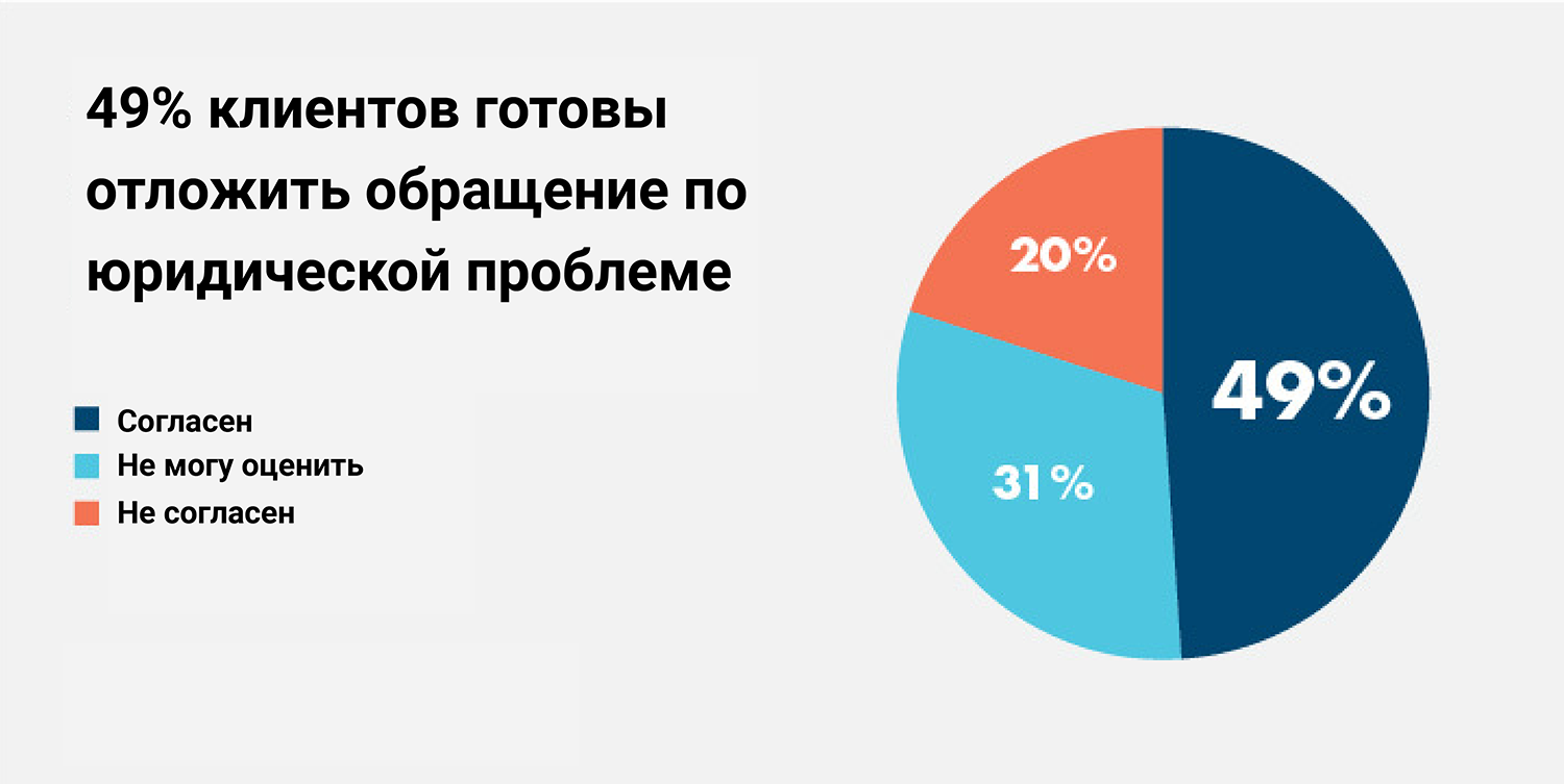 49% опрошенных утверждают: если бы у них сейчас был правовой вопрос, они хотели бы отложить обращение за юридической помощью до тех пор, пока пандемия коронавируса не утихнет.