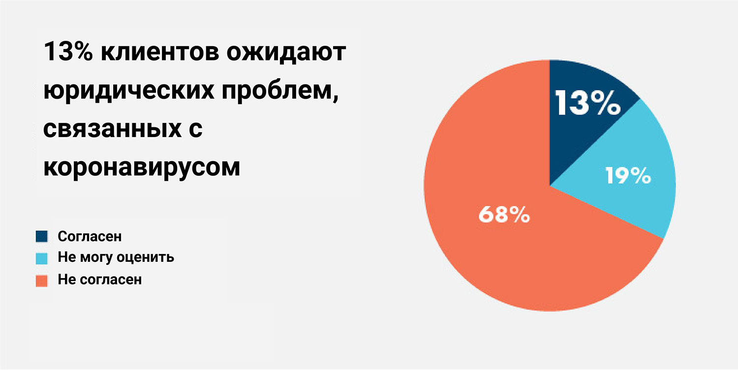 60% клиентов отмечают, что они все равно будут обращаться за юридической помощью, а не решать проблему каким-то другим способом. 13% ожидают возникновения правовых проблем, связанных с коронавирусом.