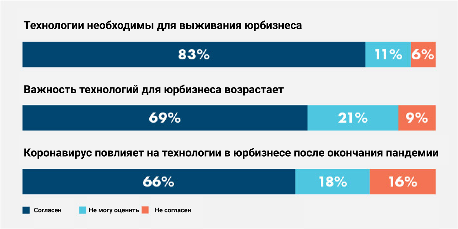 Коронавирусный кризис заставил юристов и потребителей изменить свои взгляды на технологии, говорится в докладе Clio. 69% юристов видят, что пандемия спровоцировала рост значимости технологий применительно к их фирмам. 83% говорят, что облачная технология необходима для выживания компании. 2/3 юристов считают, что новые практики работы сохранятся и после пандемии.