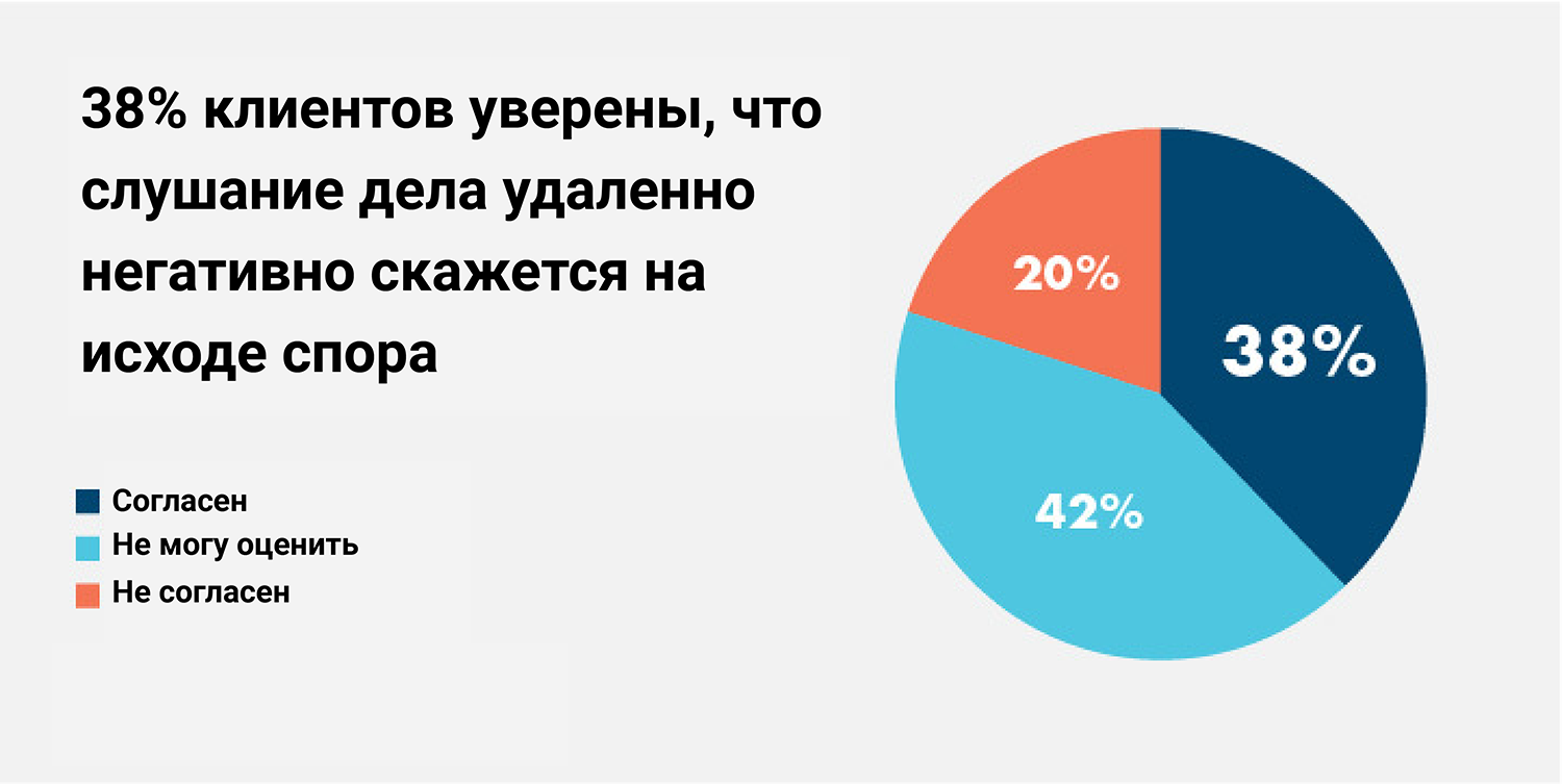 Среди клиентов 58% утверждают: если бы им пришлось нанимать юриста в ближайшие два месяца, они предпочли бы встретиться по видео-конференц-связи, а не лично. Тем не менее онлайн-суды пока вызывают у них недоверие.