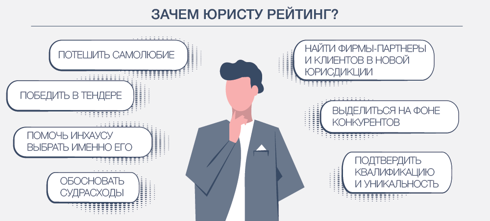 Если клиент не уверен, какого консультанта выбрать, на первый план выходит фактор признания компетенции юриста и фирмы. Большая часть рейтинга – история тщеславия, признают сами юристы, но оставшаяся доля может оказаться решающей, особенно если речь идет о тендере, победа в котором необходима компании.