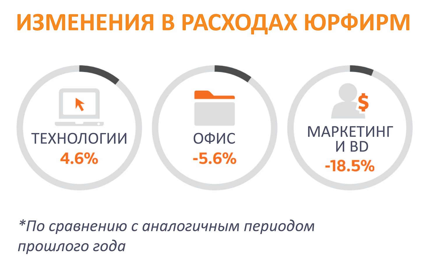 Как и ожидалось, расходы фирм сократились. В первом квартале 2020 года прямые расходы выросли примерно на 5%, в то время как во втором они составили лишь 2,3%. При этом расходы фирмы на технологии выросли на 4,6%, в то время как затраты на офисные помещения снизились на 5,6%, а накладные расходы на маркетинг и развитие бизнеса упали на 18,5%.