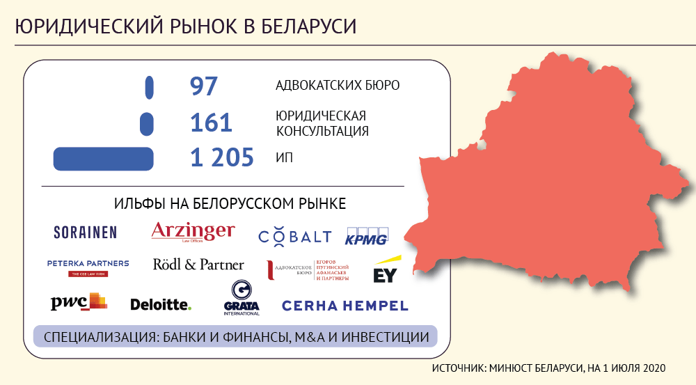 Белорусский юррынок небольшой и основная часть игроков на нем – местные юрфирмы. Доля иностранных юркомпаний не превышает 3%, отмечает Степановский. Населения меньше по сравнению с Россией и немного крупных клиентов, поясняет Вашкевич. Больше всего денег местным юристам приносит корпоративная практика. Это до 45% выручки фирмы АБ «Степановский, Папакуль и партнеры», утверждает Степановский.