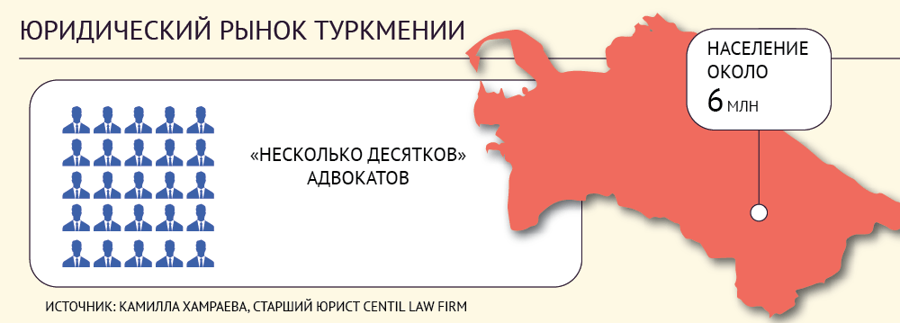 Юридический рынок в Туркменистане практически не развит. Юристов в стране очень мало, и они занимаются всеми вопросами, утверждает Хамраева. Специалисты там местные и могут оказывать услуги клиентам, если получили специальную лицензию от Минюста. Иностранцам такие документы не выдают, поэтому ильфов там нет, как и юркомпаний из соседних стран, говорит Хамраева.
