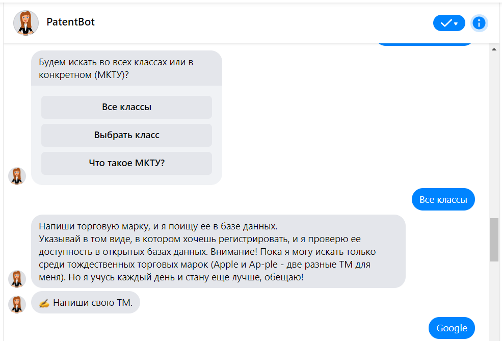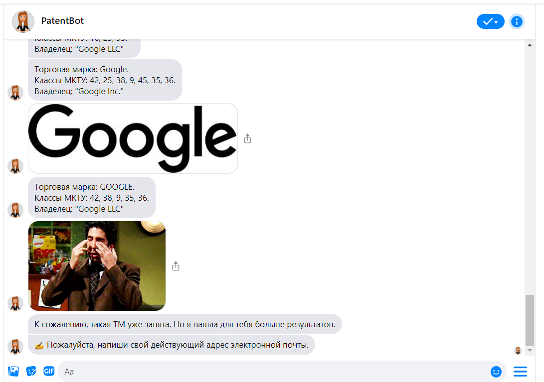 PatentBot – это виртуальный помощник, который встроен в мессенджер Фейсбука. С его помощью можно зарегистрировать торговую марку, зафиксировать авторские права или оформить Provisional Patent в США, ЕС, Украине и некоторых других странах (России нет). Бот не только предлагает платные услуги и собирает контактные данные клиентов, но и может бесплатно проверить по открытым базам, свободно ли то или иное наименование.