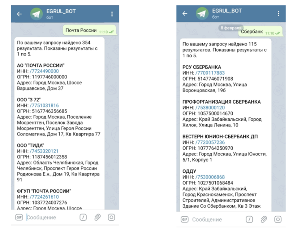 «Подружить» бота с открытыми базами – сравнительно несложная в исполнении и беспроигрышная идея. Есть российский пример – EGRUL_BOT. Он встроен в «Телеграм» и позволяет быстро проверить контрагента.