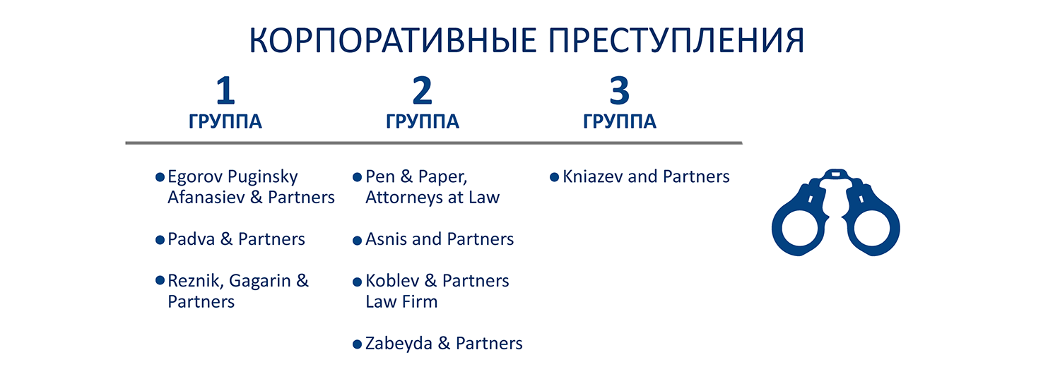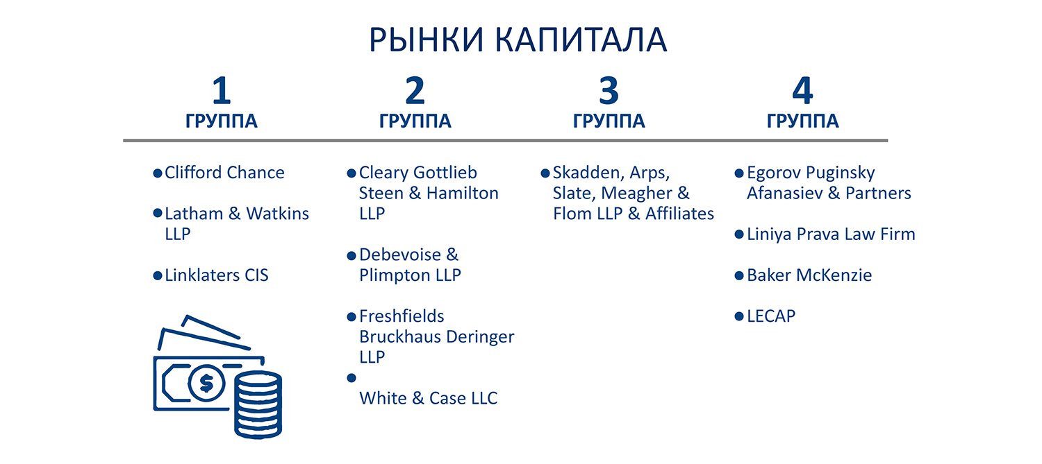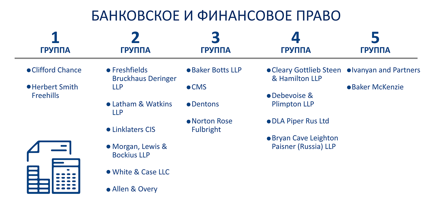 В банковском и финансовом праве появилась пятая группа. В нее вошло АБ . Остальное в разделе без изменений. Не произошло изменений в «Корпоративных преступлениях» и «Международной практике». Существенных перестановок нет и в разделе «Рынки капитала», за исключением того, что спустилась на группу.