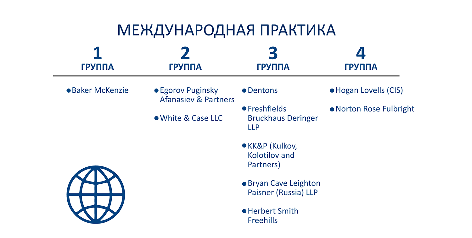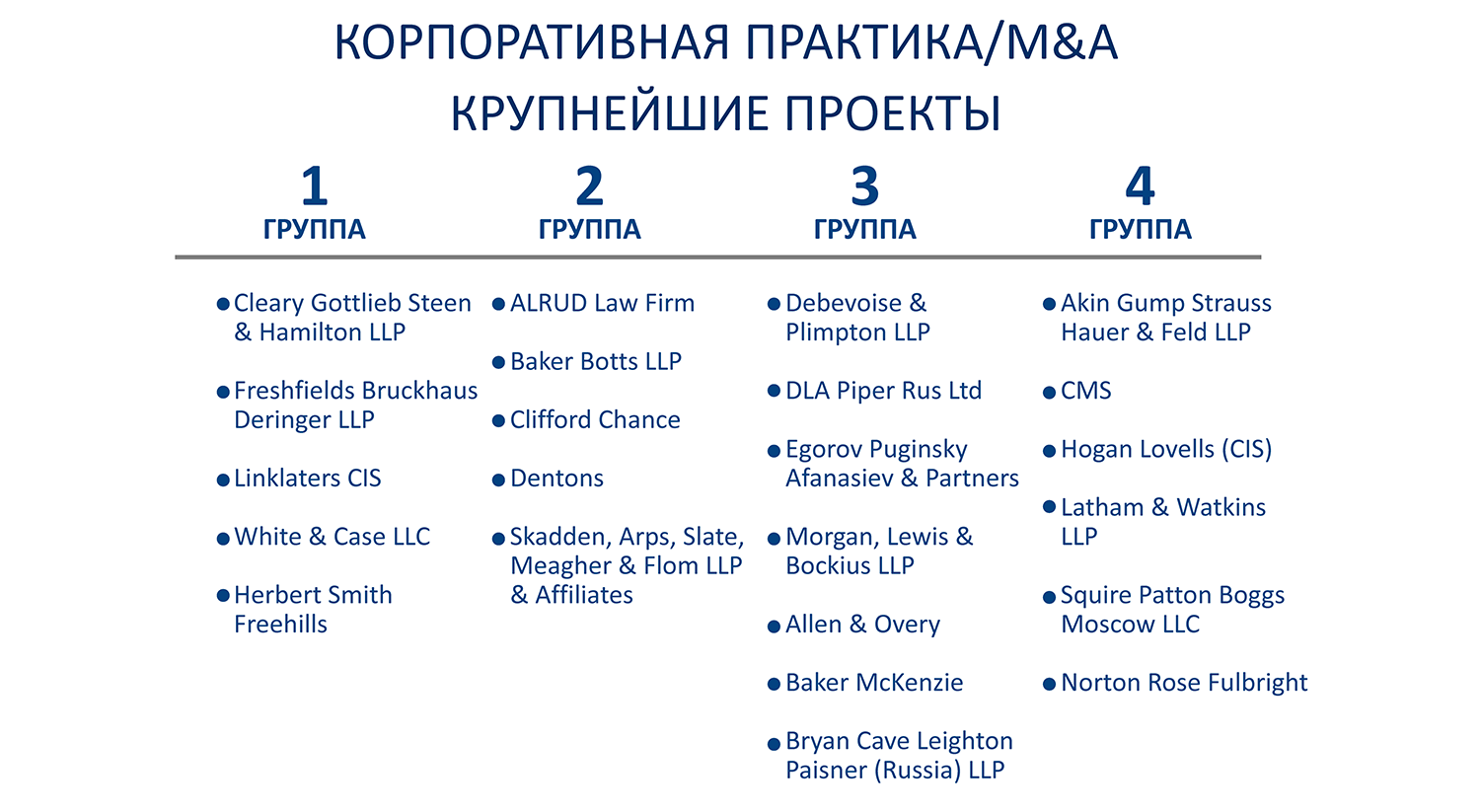 Незначительные перемены произошли в разделе крупнейших проектов корпоративной практики/слияний и поглощений: переместился из второй в третью группу.