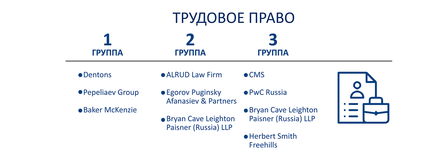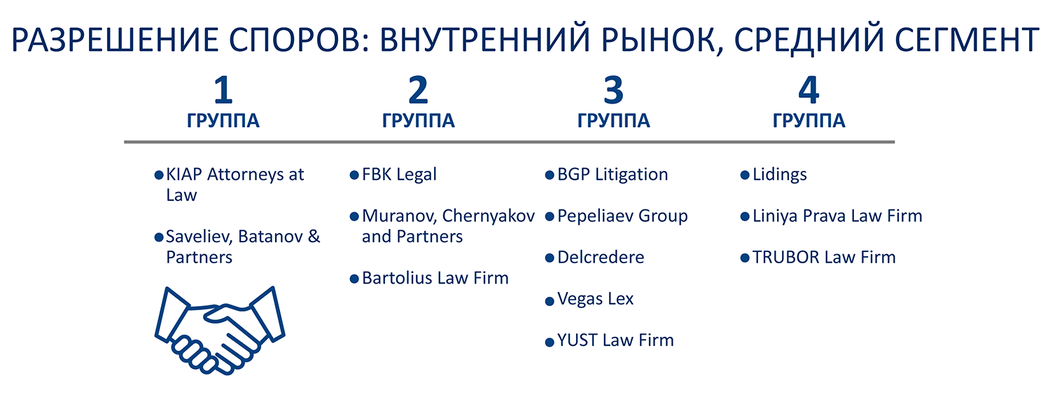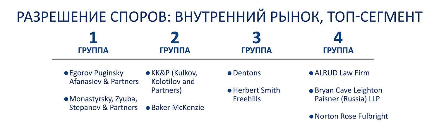 В разделе разрешения споров топ-сегмента в первой группе оказались и ЮФ , кроме них отечественный рынок в разделе представили и . В среднем сегменте в первой группе АБ и . В первую группу по трудовому праву из российских компаний вошла ЮК .