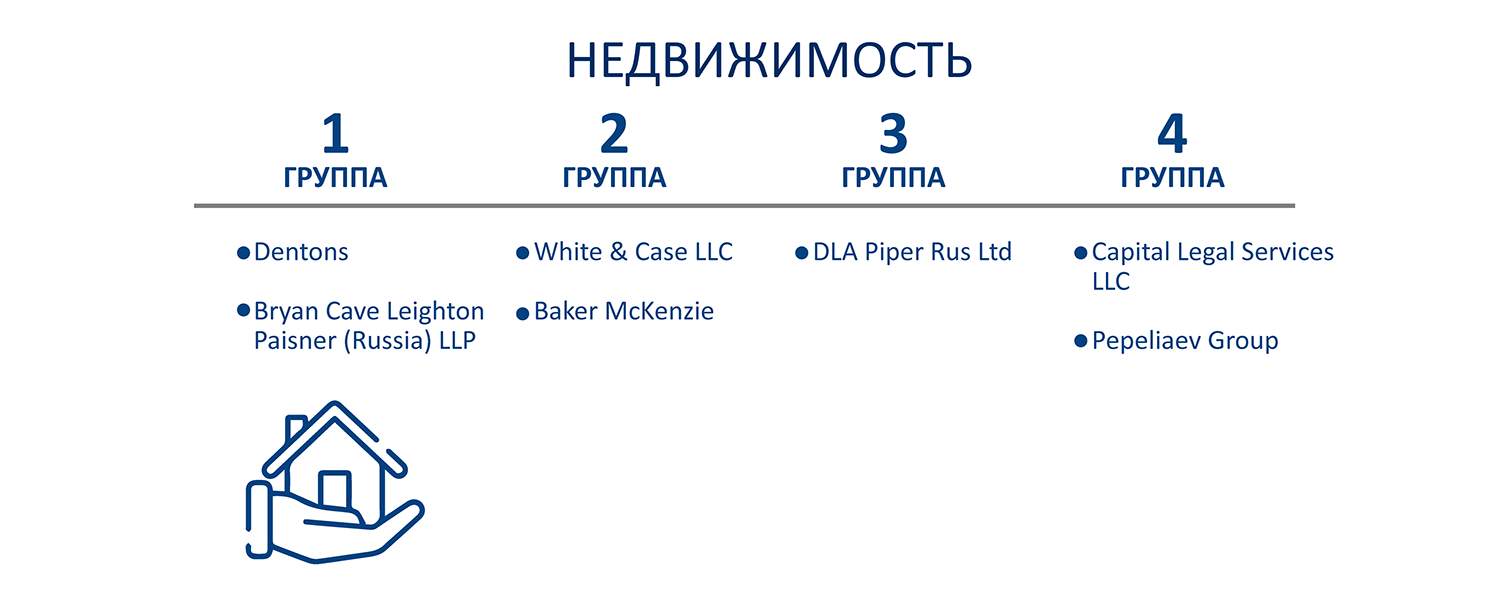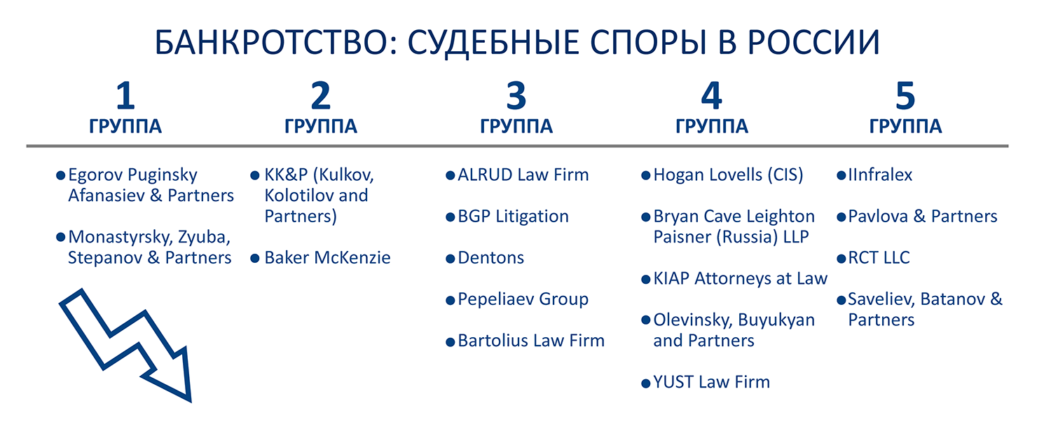 В судебной практике по банкротству в первых двух группах без изменений, а в других есть перестановки. спустился ниже на одну группу. В пятую группу добавились и , а , CMS, ЮК вышли из рейтинга в этом году.