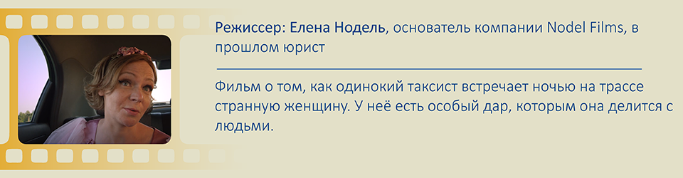 Тогда ролик, который сняла Нодель вместе с коллегой, получил сразу два корпоративных «Оскара» – за лучшую женскую роль и за лучшую роль второго плана. «Так что моя кинокарьера началась с «Оскара», – шутит Нодель. Но после этого ролика она уже не смогла остановиться. Еще работая юристом, сняла свой первый короткометражный фильм «Талант», который побывал на Каннском фестивале. Она была не только режиссером, но и сценаристом, продюсером и даже сама написала песню. Год спустя она сняла короткометражку «Живой товар» по рассказу Чехова. В «ее послужном списке» есть лирическая комедия «Привет, оружие!», одноминутная драма «Кукла Надя» и другие. Сейчас Нодель основала кинокомпанию Nodel Films. Она признается, что юридический опыт ей пригодился, начиная от помощи коллегам до умения презентовать проект, структурировать и перераспределять задачи.