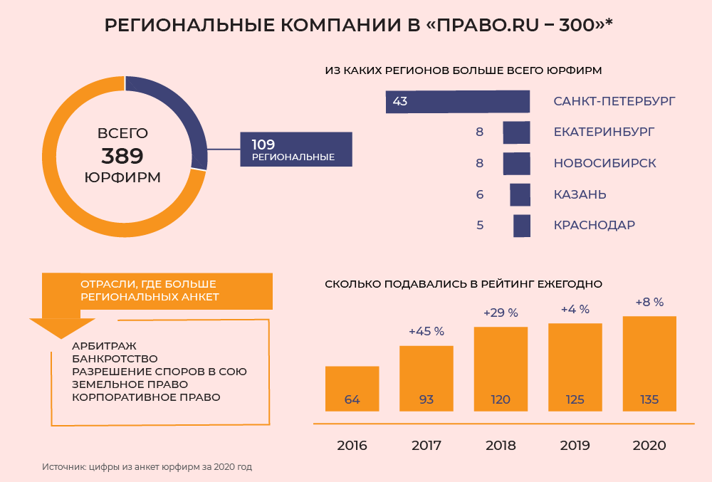 Большинство опрошенных нами руководителей региональных юрфирм говорят, что стали подаваться в рейтинги лишь в последние пять лет. Это подтверждает и статистика исследования «Право.ru-300». Для него в 2016 году прислали свои анкеты лишь 64 нестоличные фирмы, а в 2020-м их число выросло более чем в два раза – заявки поступили от 135 компаний. Связано это еще и с «возрастом» компаний. У многих он составляет пять лет или немногим больше. Правда, именно такие команды стали подаваться в рейтинги наиболее осознанно. Изучая правила игры на юррынке, поняли, как важна независимая сторонняя оценка нашей команды авторитетными и опытными коллегами, объясняет управляющий партнер Станислав Петров.