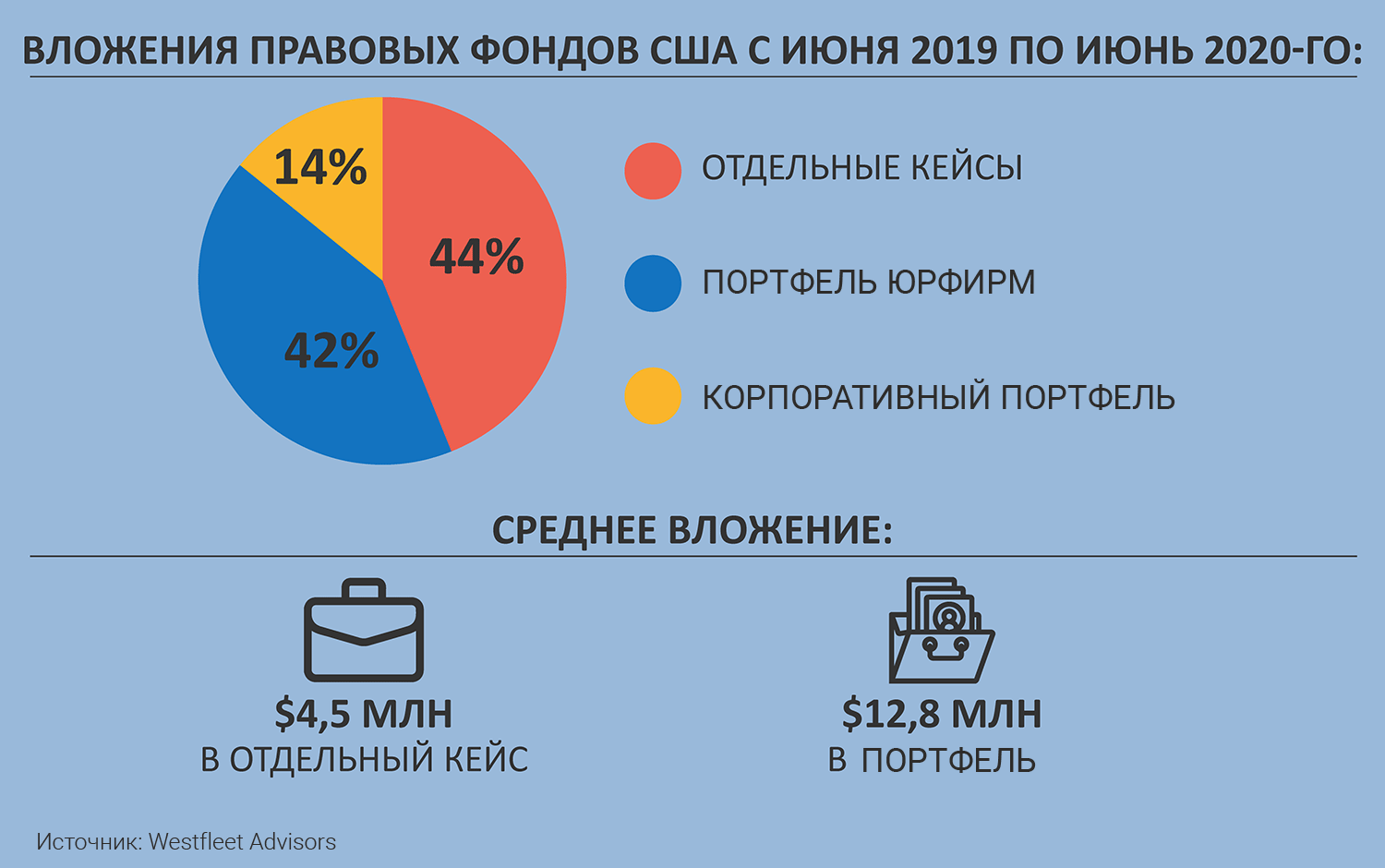 Правовое финансирование — это привлечение одного или нескольких инвесторов, которые готовы покрыть судебные расходы в обмен на часть присужденной суммы в случае выигрыша. Чаще всего такими инвесторами становятся специальные фонды. Рынок очень активно растет, и в 2019 году его капитализация по всему миру, по оценке юрфирмы Brown Rudnick, достигла $39 млрд. Только в Соединенных Штатах правовое финансирование привлекло уже более $11 млрд инвестиций. В 2020-м этот рынок вырос на 6%.