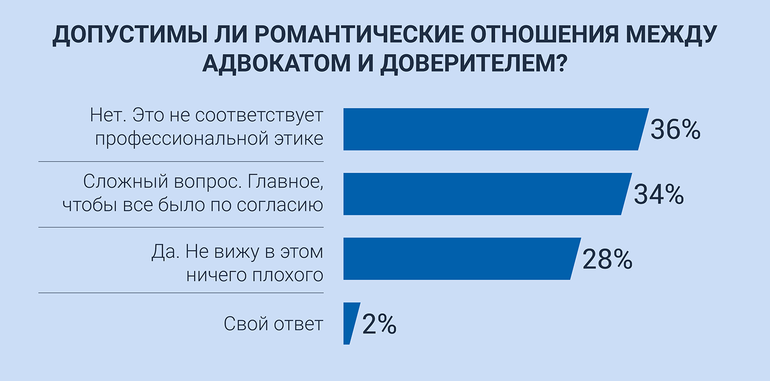 Кто-то написал, что надо отталкиваться от положений адвокатского кодекса: раз фамильярные отношения недопустимы, то и романтические тоже. Распространенным оказалось мнение, что начинать отношения можно, когда они не мешают работе. Отношения позволительны, если адвокат и доверитель ранее состояли в любовной связи или если они женаты. Один из юристов добавил, что сексуальные отношения не должны быть условием профессионального представительства, доверитель и адвокат не должны чувствовать никакого давления по этому поводу.