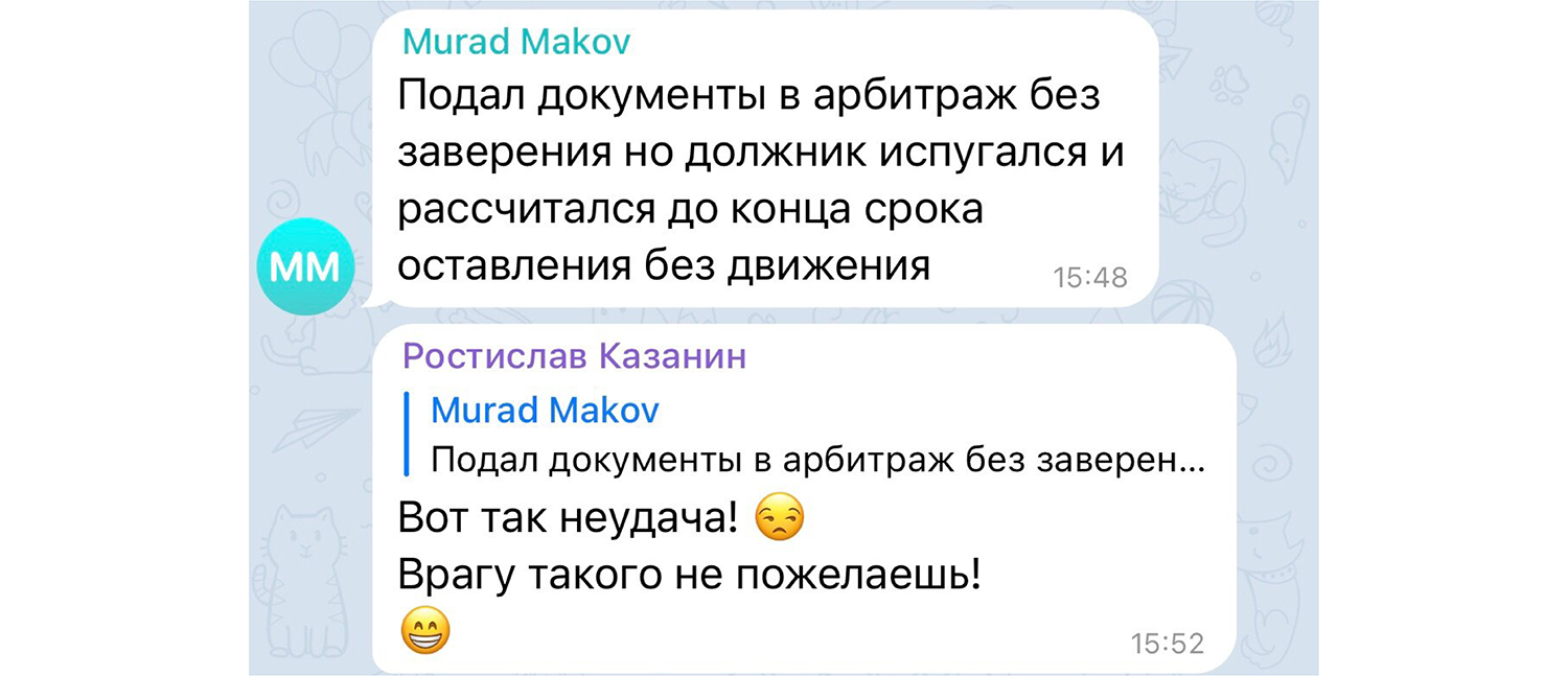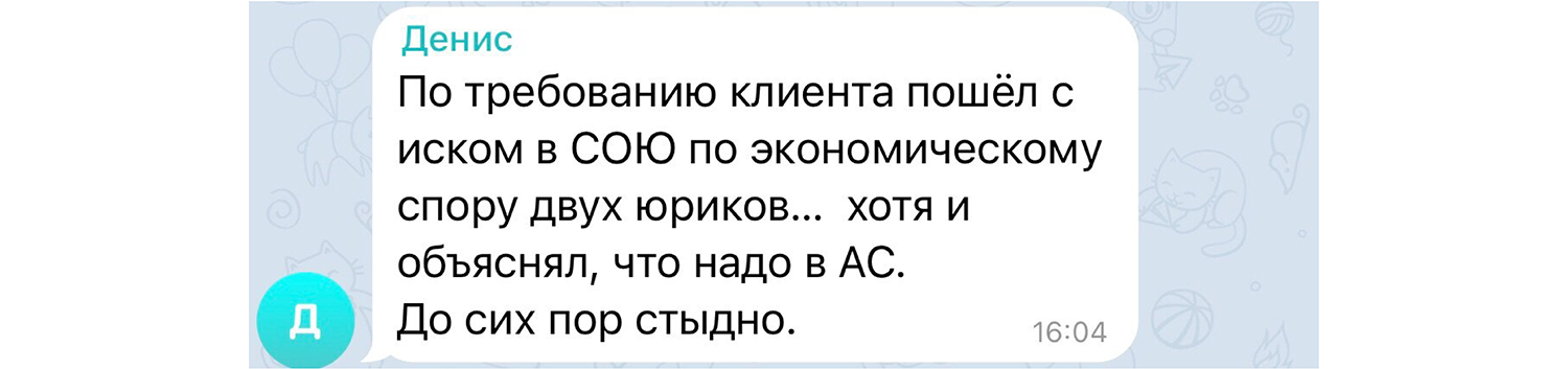 А еще надо с аккуратностью подходить к просьбам доверителей. Некоторые из них могут не знать юридических тонкостей и настаивать на абсурдных вещах. Одна из читательниц уверена, что такому клиенту лучше отказать с мотивировкой: «Позориться придется мне, а репутация дороже денег». Сложнее в подобных случаях приходится инхаусам, которым просто так нельзя игнорировать указания начальства, даже самые странные. Надо поступать мудрее: попробовать донести верную позицию до руководителя. Все та же подписчица отмечает, что, с одной стороны, не стоит держаться за таких работодателей, а с другой — можно учиться убеждать их, когда «пожелания идут вразрез с законом».