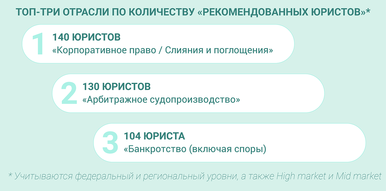 Больше всего рекомендованных юристов по традиции в трех отраслях: корпоративное право, арбитражное судопроизводство и банкротство.