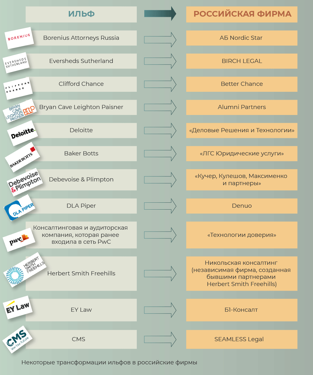 По наблюдениям Панченкова, , все иностранные клиенты, которые сотрудничали с командой его компании в формате международного офиса, перешли в российскую фирму. Во-первых, клиенты продолжают работать с конкретными юристами и партнерами, которые годами их не подводили в плане сервиса и качества. У них существуют логичные ожидания, что не подведут и теперь. Во-вторых, в качестве альтернативы там сейчас будут такие же российские фирмы, которые создают юристы из других ильфов, или, опять же, присутствовавшие на рынке до последних событий российские фирмы. Клиент разумно делает выбор в пользу понятной парадигмы взаимоотношений с понятными ему людьми.