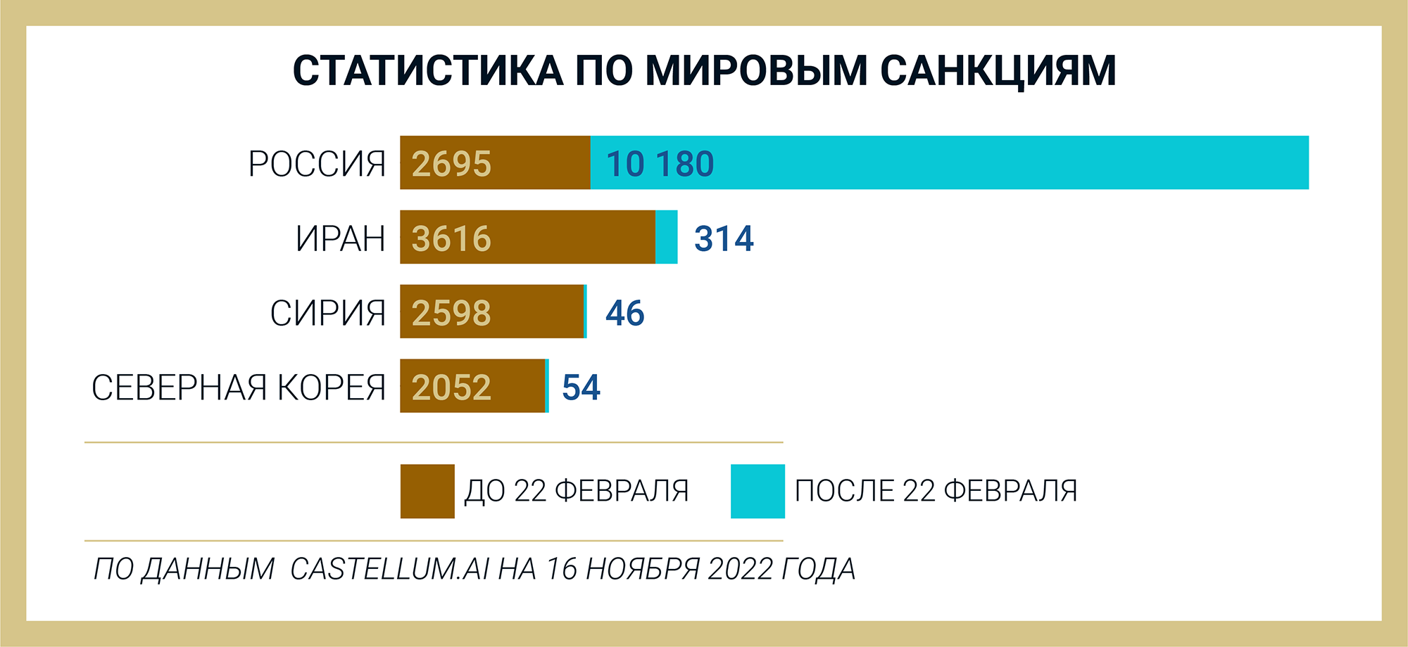 Еще в марте Россия стала мировым лидером по количеству введенных против нее санкций, писал Bloomberg. Издание со ссылкой на данные глобальной базы для отслеживания санкций Castellum.ai сообщала, что РФ обошла в этом вопросе Иран, Сирию и КНДР. В мае спикер Госдумы Вячеслав Володин насчитал 10 128 санкций против России. Только 2700 из них — реакция на события 2014 года, и эти меры сокрушительного влияния на экономику и внутренний бизнес не оказали: о них мало говорили и почти не замечали. После начала СВО к середине ноября, по сведениям Castellum.ai, международное сообщество добавило еще 10 180 санкций — суммарно в три с половиной раза больше, чем за последние восемь лет.