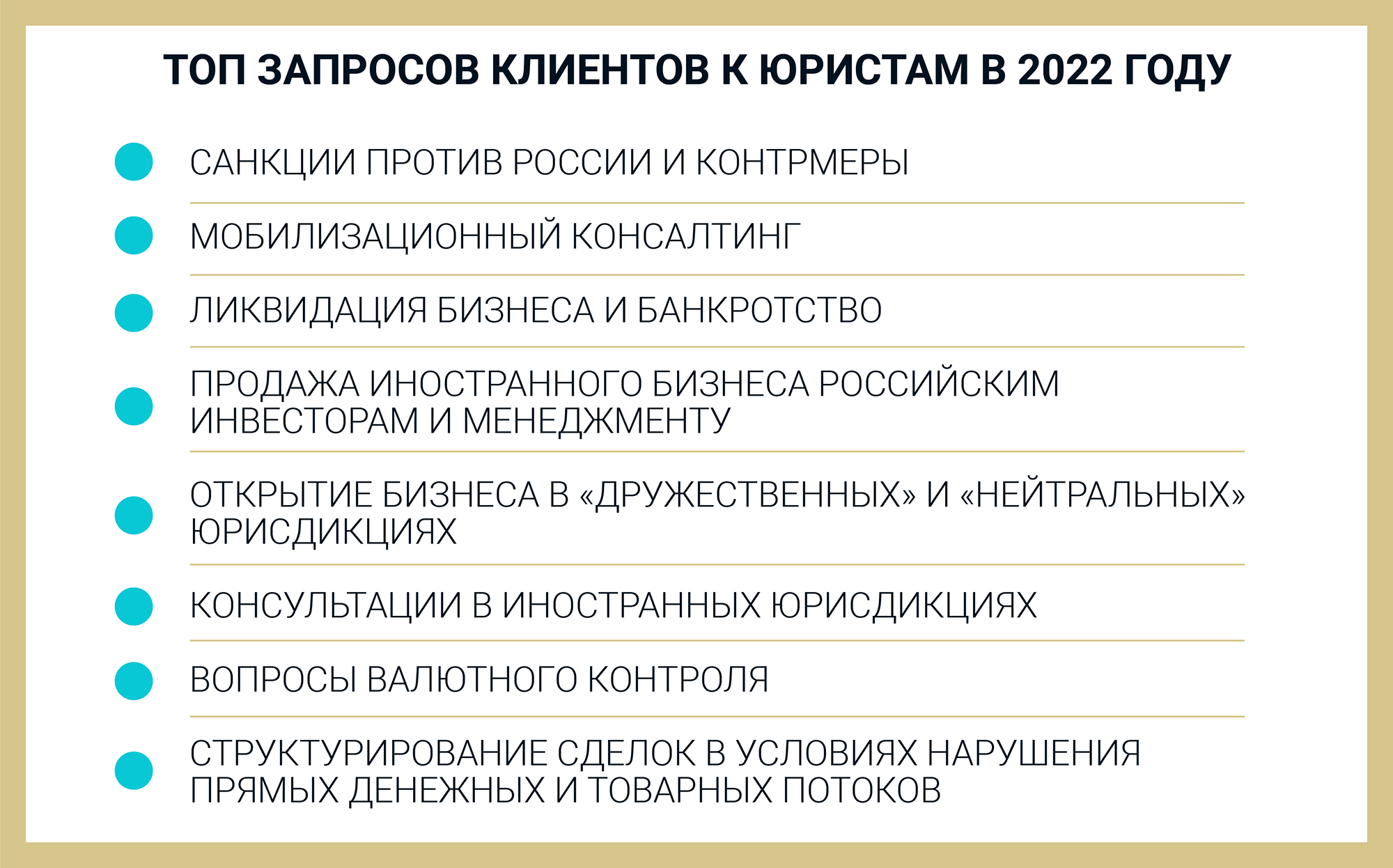 Тимчук отмечает, что в их коллегии лидирующий запрос — подача заявлений к иностранным регуляторам. Так компании пытаются получить разрешение для разблокировки ценных бумаг и денег, заблокированных из-за санкций против Национального расчетного депозитария. Еще среди лидирующих эксперт выделяет запросы, которые связаны с ответными мерами РФ против недружественных государств. Например, компании не понимают, как теперь платить дивиденды иностранным фирмам, как исполнять сделки, объясняет Тимчук. Александр Ерасов, партнер налоговой практики , обращает внимание, что стали востребованы запросы на реструктуризацию бизнеса, изменение структур владения.
