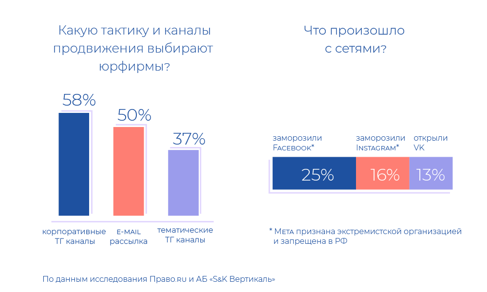 В сентябре 2022-го на конференции Правo.ru по юрмаркетингу Мария Мещерякова, директор по маркетингу и PR , презентовала исследование, из которого следует: большинство юрфирм создают корпоративные телеграм-каналы, а некоторые — еще и тематические.