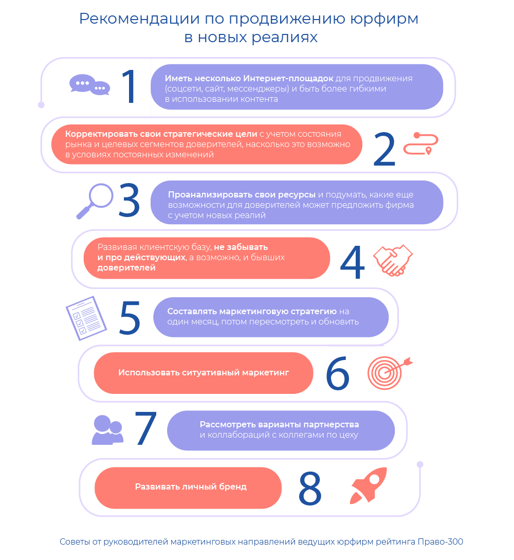 От маркетинговых менеджеров ведущих юрфирм собрали рекомендации по продвижению компании в изменившихся условиях.