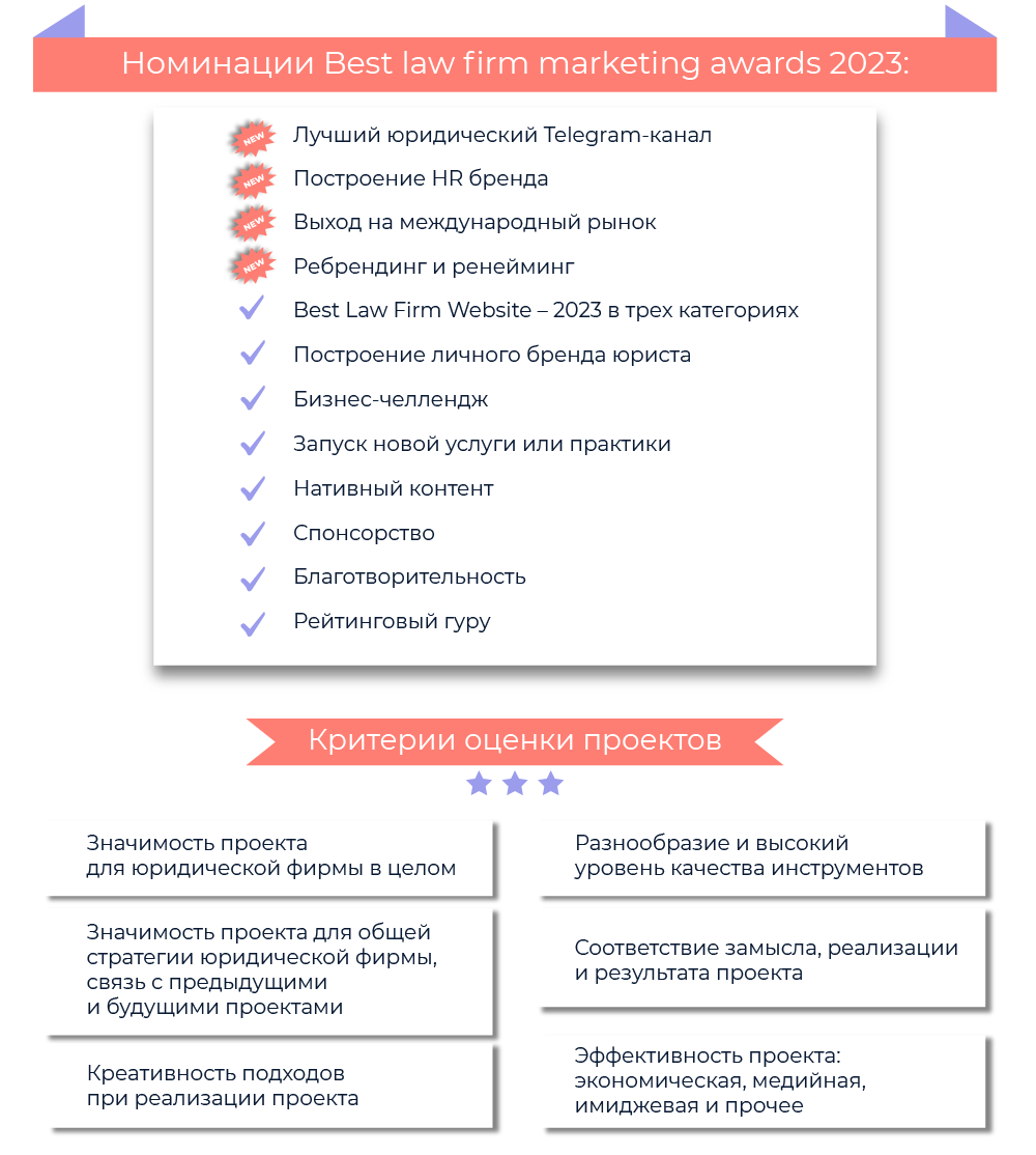 14 сентября пройдет третья церемония награждения лидеров Best Law Firm Marketing — 2023. В этот раз эксперты будут оценивать проекты в 12 номинациях по шести критериям.