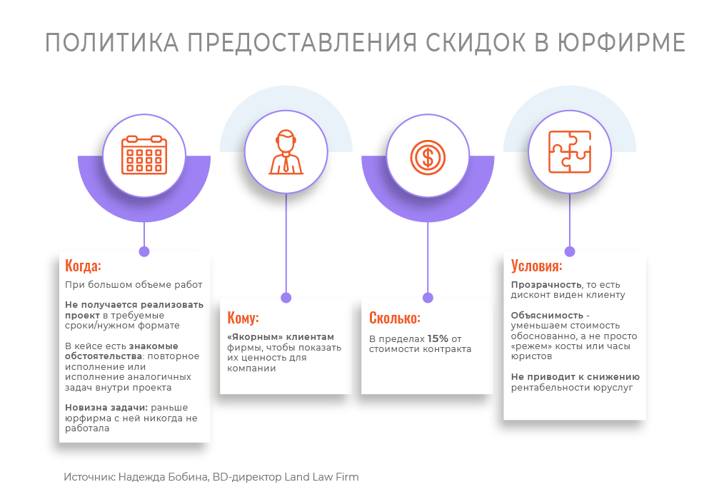 Бывают случаи, когда юрфирме точно не стоит давать скидку. К таким ситуациям Эрвиц относит услуги для «клиентов-однодневок». Речь идет о тех, кто приходит за разовой работой, например продать свой единственный актив. Скидка — привилегия для лояльных клиентов, соглашается с коллегой Зеленин.