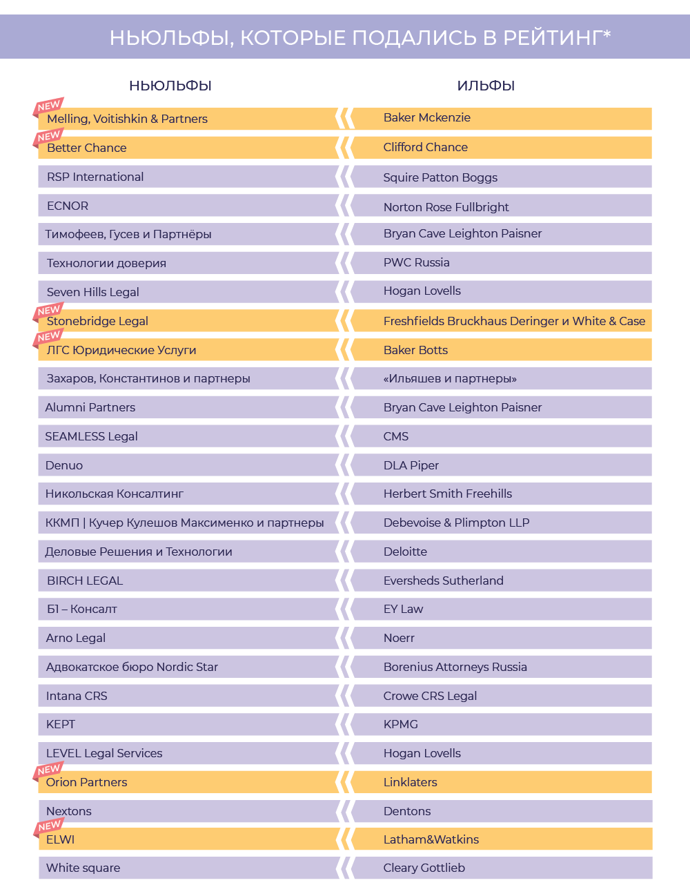 Немногие иностранные юрфирмы, работавшие в России, участвовали в отечественных рейтингах. После ухода ильфов их отечественные команды, создавшие ньюльфы, наоборот, охотно пошли и в «Право-300», и в «Коммерсантъ». Управляющий партнер одной из таких компаний ( ) Сергей Войтишкин объясняет зачем: «Стоит подаваться тем, кто ищет новых клиентов, кто хочет удержать или расширить долю на рынке. Кроме того, рейтинг дает возможность получить приглашение от потенциального доверителя и поучаствовать в тендере». Тем более, заказчикам больше нельзя указывать в конкурсной документации, что подрядчики должны фигурировать в иностранных юррейтингах (дело № А40-127035/2022).