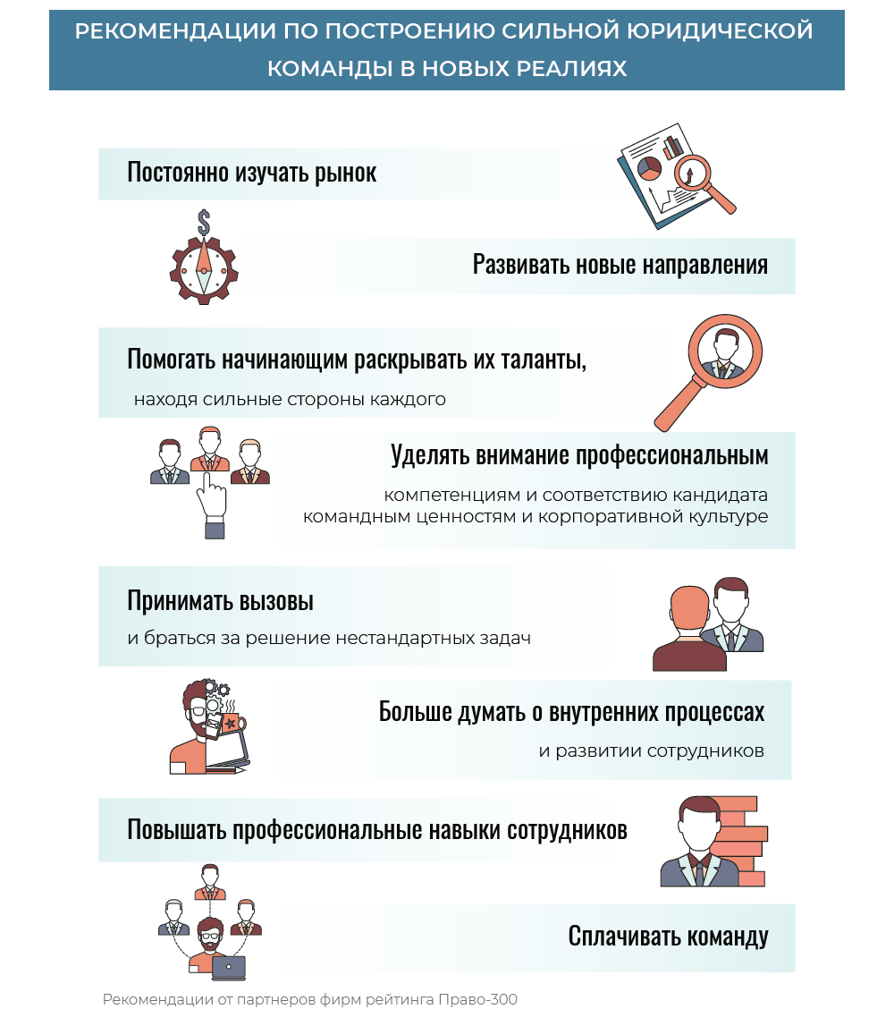 Построить экологичную и безопасную среду — важная часть эффективности сотрудников, но в жизни юрфирм играют важную роль и другие аспекты. Несмотря на продолжающуюся турбулентность, юркомпаниям надо развиваться. Для этого нужна сильная команда, способная выстоять в кризисный период и идти вперед.